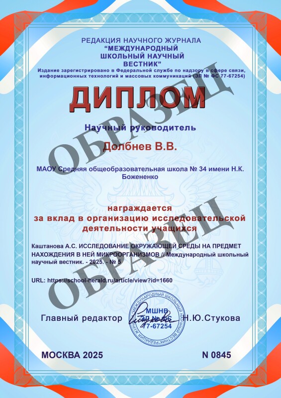 Каштанова А.С. ИССЛЕДОВАНИЕ ОКРУЖАЮЩЕЙ СРЕДЫ НА ПРЕДМЕТ НАХОЖДЕНИЯ В НЕЙ МИКРООРГАНИЗМОВ // Международный школьный научный вестник. 2025. № 5. ;URL: https://school-herald.ru/ru/article/view?id=1660 (дата обращения: 06.11.2025).