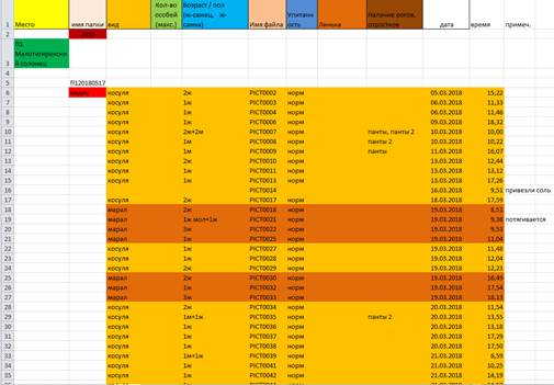 Всего было отсмотрено около 10 000 файлов, полученные с фотоловушек в течение двух лет, что является первичной обработкой для последующего анализа данных. Структура базы данных, которая была разработана, включает следующие сведения: место установки фотоловушки, имя папки (каталога), вид животного, количество особей (одновременно зафиксированных на солонце), возраст, пол, имя файла (кадра), состояние животного (упитанность), стадия линьки, наличие рогов, отростков, время суток (день/ночь), (Рис. 1).