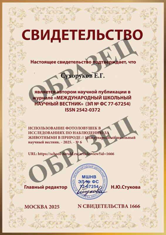 Сухоруков Е.Г. ИСПОЛЬЗОВАНИЕ ФОТОЛОВУШЕК В ИССЛЕДОВАНИЯХ ПО НАБЛЮДЕНИЮ ЗА ЖИВОТНЫМИ В ПРИРОДЕ // Международный школьный научный вестник. 2025. № 6. ;URL: https://school-herald.ru/ru/article/view?id=1666 (дата обращения: 08.01.2026).