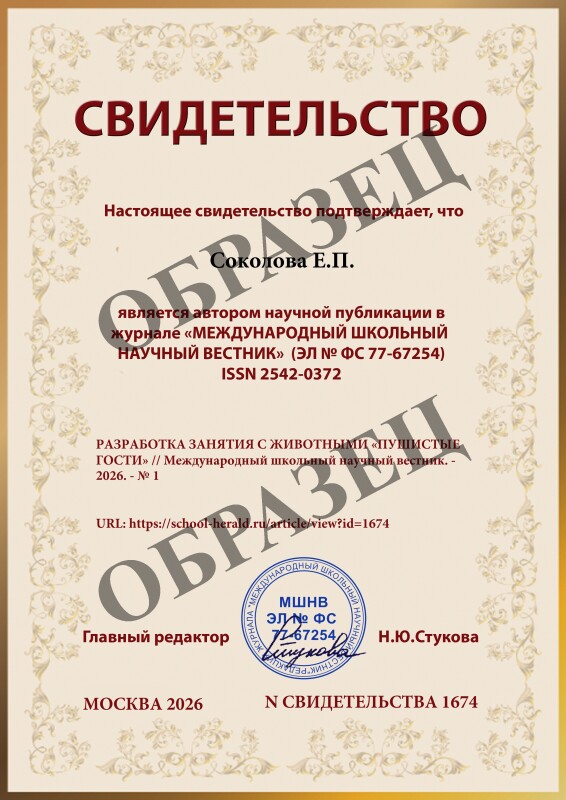 Соколова Е.П. РАЗРАБОТКА ЗАНЯТИЯ С ЖИВОТНЫМИ «ПУШИСТЫЕ ГОСТИ» // Международный школьный научный вестник. 2026. № 1. ;URL: https://school-herald.ru/ru/article/view?id=1674 (дата обращения: 13.03.2026).